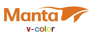 - DM0000: The mark consists of the word "Manta" located to the left of a stylized imagery of a manta ray, both in the color orange positioned above the word "v-color" wherein "v" "-" are red, the first "o" is orange, "c" is blue, "l" is green, the second "o" is yellow, and "r" is purple..