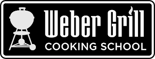DM0000: The mark consists of the stylized wording "WEBER GRILL COOKING SCHOOL" centered within a rounded corner rectangle within the outline of a larger rounded corner rectangle. The stylized wording appears to the right of the silhouette of a three-legged kettle grill, with "WEBER GRILL" above the wording "COOKING SCHOOL". The "I" in "GRILL" features a dot in the shape of a flame.