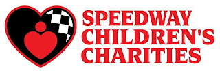 DM0000: The mark consists of a red heart-shaped outline with a black center, with a black and white checkered pattern design appearing in the top right portion of the heart. In the center of the heart is an image of a stylized person, formed by a red circle appearing above a smaller red heart design. All of the foregoing appears to the left of the wording "SPEEDWAY CHILDREN'S CHARITIES" in red stylized font.