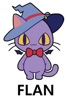 - DM0000: The mark consists of a purple cat with black wings, black whiskers and yellow eyes with black pupils, standing upright, wearing a red bow tie and a blue hat with a red band and a yellow bead on the brim, and one purple and pink ear poking out from the hat brim, all above the word "FLAN".