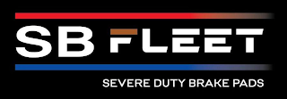 DM0000: The mark consists of The white words "SB FLEET" are written between a red horizontal bar with red gradation at the right side of the red horizontal bar and a blue horizontal bar with blue gradation at the right side of the blue horizontal bar, and the smaller white words "SEVERE DUTY BRAKE PADS" are written below the blue horizontal bar aligned to the right of the blue horizontal bar, wherein the word "FLEET" is of a smaller font size than the word "SB" and is of a larger font size than the words "SEVERE DUTY BRAKE PADS," and the upper portion of the letter "F" of "FLEET" is brown, all on a black background.