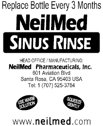 DM0000: The mark consists of the wording "REPLACE BOTTLE EVERY 3 MONTHS" above the stylized wording "NEILMED" above the stylized wording "SINUS RINSE" appearing within a solid rectangle shape with rounded corners. Below "SINUS RINSE" appears the wording "Tel: 1 (707) 525-3784." Beneath the phone number appear two solid oval shapes; the left oval containing the wording "USE WARM SOLUTION" and the right oval containing the wording "SQUEEZE GENTLY." Below the oval shapes appears the wording "WWW.NEILMED.COM".