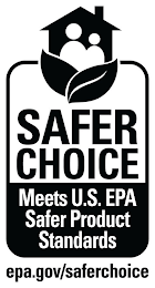 DM0000: The mark consists of a box with curved corners containing the words "SAFER CHOICE" on a transparent background above a rectangle with a shaded background containing the words "MEETS U.S. EPA SAFER PRODUCT STANDARDS". At the top of the box are two human figures featured within a house above two leaves with one leaf bisected by a curved line. The URL, "EPA.GOV/SAFERCHOICE" appears beneath the box.