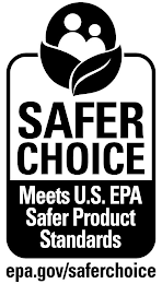 DM0000: The mark consists of a box with curved corners containing the words "SAFER CHOICE" on a transparent background above a rectangle with a shaded background containing the words "MEETS U.S. EPA SAFER PRODUCT STANDARDS". At the top of the box are two human figures featured within a partial sphere above two leaves with one leaf bisected by a curved line. The URL "EPA.GOV/SAFERCHOICE" appears beneath the box.