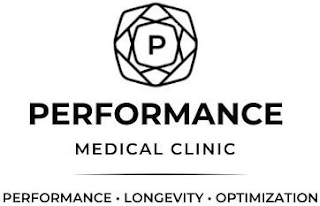 DM0000: The mark consists of the letter P in a geometric design of a square with rounded sides surrounding a diamond with polygons in the corners surrounding another square with rounded corners, all above the word PERFORMANCE, which is above the words MEDICAL CLINIC, which is above the words PERFORMANCE LONGEVITY OPTIMIZATION with a dot between the words PERFORMANCE and LONGEVITY and a dot between the words LONGEVITY and OPTIMIZATION.