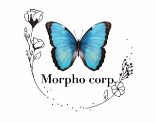 - DM0000: The mark consists of the wording 'MORPHO CORP.' in black appearing between a stylized design of a butterfly in grey, black, white, blue, yellow and pink, and two curved, flower plants in black and white and several small circles in black and black and white and semicircles in black.