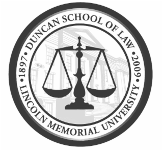 DM0000: The mark consists of a seal comprising two outer rings surrounding a border ring, the border ring surrounding an inner ring, with a background image of a building therein and scales overlaid thereon, with the terms "1897", "DUNCAN SCHOOL OF LAW", "2009", and "LINCOLN MEMORIAL UNIVERSITY" appearing on the border ring, each of the aforesaid terms being seaprated by a solid circle.