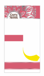 - DM0000: The mark consists of a pink and silver mandala design at the top of the mark; there is a half circle near the left that interrupts the mandala design; the word GURU appears in a stylized black script; the word NANDA appears in stylized black script below the word GURU; approximately halfway down the mark there is a pink rectangle on the left-hand side; below is a yellow arrow design that swoops down and to the right; below the arrow is a pink rectangle that extends entirely across the mark; there are two silver horizontal lines across the rectangle near its top and bottom.