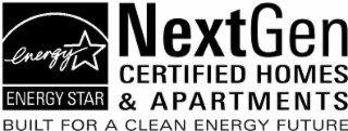 DM0000: The mark consists of a shaded square containing, from top to bottom, a curved line box above the stylized word "ENERGY" connected to the left of a five-point star, a horizontal line, and the words "ENERGY STAR" in stylized font. To the right of this appears the wording "NEXTGEN" in stylized font. Below these appear the stacked wordings "CERTIFIED HOMES & APARTMENTS" and "BUILT FOR A CLEAN ENERGY FUTURE" in stylized font.