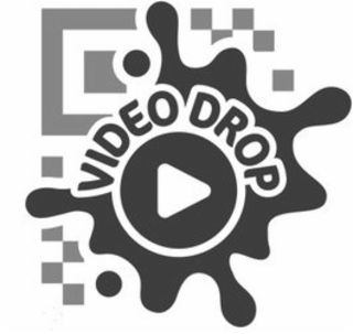 - DM0000: The mark consists of the stylized word "VIDEODROP" arching over the top of a stylized play button contained within a circle. The play button and "VIDEODROP" stylized words are centered on top of an ink splat, all placed over a series squares including a partial square in the upper left corner of the mark outlining a smaller square within it.