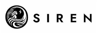 - DM0000: The mark consists of the word “SIREN” in a sans-serif typeface. To the left of the word mark is a circular emblem featuring a stylized figure of a woman with flowing hair that transforms into natural, wave-like forms. Above the woman is a lightning bolt.