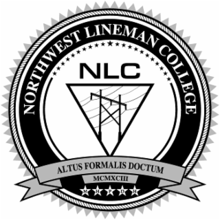 DM0000: The mark consists of The mark consists of the stylized letters and wording "NORTHWEST LINEMAN COLLEGE N L C ALTUS FORMALIS DOCTUM MCMXCIII M H P D H" and design. The design consists of several concentric circles. The outer most circle has a scalloped edge. The two inner most circles are much smaller than the outer circles and within the space created between the inner circles and the outer circles is the wording "NORTHWEST LINEMAN COLLEGE" that curves above the inner two circles. Centered within all of the circles is an inverted triangle and within the triangle is a stylized design of a power pole. Above the power pole are the letters "N" "L" and "C" on the top line of the triangle. A banner is superimposed across the bottom portion of the circles and it includes the wording "ALTUS FORMALIS DOCTUM" above a smaller banner including the Latin numeric date "MCMXCIII" which is placed above five stars and each star contains one of the letters "M" "H" "P" "D" "H".