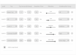 + 10 10 10 99 10 X X X X X LEVEL LEVEL 1 TOY SELECT TOY LEVEL 2 ALL LUSH 3 LEVEL 3 LEVEL 4 LOVENSE SEX..! LEVEL 5 LOVENSE SEX..! ADD A NEW LEVEL TIP AMOUNT(TOKENS) 100 301 REACTION TIME 300 INFINITY SEC SEC SEC VIBRATION LOW LOW MEDIUM HIGH ULTRA HIGH ROTAION/AIR PUMP OFF LOW MEDIUM HIGH ULTRA HIGH 50
