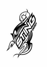 - DM0000: The mark consists of the word "STING" outlined in black and the word "ENERGY" in black letters superimposed over a highly stylized scorpion design.