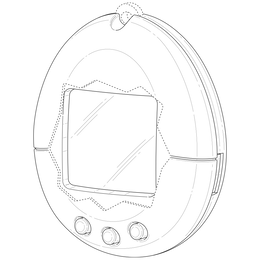- DM0000: The mark consists of a three-dimensional configuration of a handheld electronic toy with a smooth, flattened egg-shape, an inset square screen set in the middle of the front of the toy and three raised circular buttons arranged equidistant from one another in an inverted arc under the screen on the front of the toy. The broken lines depict the key chain loop and cracked outline around the screen and are not claimed as part of the mark.