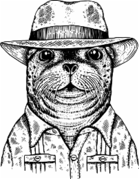 - DM0000: The mark consists of a stylized illustration of a seal depicted with human attributes, including a fedora style hat and a collared, button-down shirt with two front pockets. The seal is shown facing forward with a neutral expression. The design includes stippling and line shading to create texture and dimension.