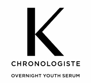 DM0000: The mark consists of CHRONOLOGISTE OVERNIGHT YOUTH SERUM horizontally stacked with the letter "K" posted directly above the letter "K" in a stylized font.