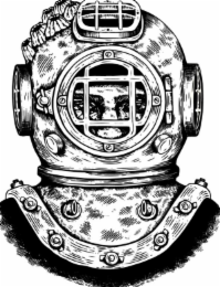 - DM0000: The mark consists of a detailed illustration of a vintage deep sea diving helmet. The helmet features prominent mechanical detailing, including circular bolts and fasteners along the collar and front faceplate. The front widow of the helmet is barred with vertical and horizontal lines forming a grid pattern, through which a pair of human eyes is visible, creating the impression of a person inside the helmet. The texture of the helmet shows shadowing and shading to create depth and a worn, metallic appearance.