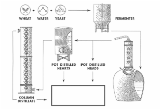 - DM0000: The mark consists of an image of a process flow diagram. There is an image of wheat in a circle with a plus sign next to the circle, an image of the chemical formula for water in a circle with a plus sign next to the circle, and a depiction of yeast in a circle, with the words "WHEAT", "WATER", and "YEAST" below each circle. Next to the "YEAST" circle is a narrow pointing to a fermenter, with the word "FERMENTER" next to it. The fermenter is pointing to a pot still. Next to the pot still is an arrow pointing to its side toward a pot distiller with the words "POT DISTILLED HEARTS"; part of this arrow extends down and points to the words "POT DISTILLED HEADS". Under both sets of words are arrows pointing down to a rectangular shape. Next to the pot distiller is an arrow pointing to the column still with the words "COLUMN DISTILLATE" under the image. Next to "COLUMN DISTILLATE"is an arrow pointing to the rectangular shape.
