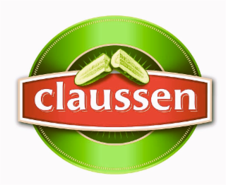 - DM0000: The mark consists of two diagonally placed halved cucumber slices above an elongated horizontal rectangle with outwardly curved long sides. The rectangle is red, bordered in white and gold, and contains the word "claussen" in lowercase white font. This central element is layered over two concentric circles. The inner circle is dark green with a gold border with green radial lines that emanate outward from the center. The outer circle is green, transitioning to dark green directly behind the red rectangle. It is encircled by a light green outer border and an inner gold-lined border.