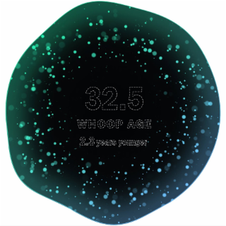 - DM0000: The mark consists of shading and dots described further herein that form an irregular circle. The color green appears around the outside edge of the shape beginning at the top, down the left side of the shape, fading to blue at the bottom of the shape, and fading back to green at the top of the shape. Varying degrees of shading in green and blue form the shape, with the green shading closest to the portion of the shape outlined in green and the blue shading closest to the portion of the shape outlined in blue. Heavy shading in green appears closest to the portion of the shape outlined in green and heavy shading in blue appears closest to the portion of the shape outlined in blue. No shading appears in the middle of the shape. Dots, in varying sizes and degrees of shading, in an irregular pattern, are clustered around the outer edge of the shape. The dots appear in green in the portion with green shading and the dots appear in blue in the portion with blue shading. The number “32.5”, the words “WHOOP AGE” and “2.3 YEARS YOUNGER” are drawn in broken lines in the middle of the shape for placement purposes only and are not claimed as part of the mark. The colors green and blue are claimed as a feature of the mark.
