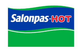 - DM0000: The mark consists of a green rectangular design with a wavy upper border. In the upper half of the rectangle, there is a blue wavy banner, below which is a wavy white line. On the blue banner, the word SALONPAS in stylized white letters and word HOT in stylized red letters outlined in white are displayed, joined by a white hyphen.