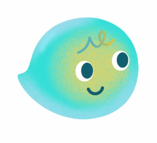 - DM0000: The mark consists of a stylized, droplet-shaped character with a turquoise, blue, and yellow gradient body, a yellow center, large white and teal eyes, a curved teal smile, and a wavy curl of hair above one eye in a gradient from teal to gold.