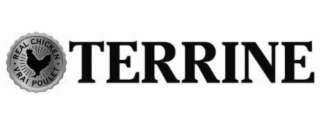 DM0000: The mark consists of the term "TERRINE" to the right of a drawing of a circular seal with a drawing of a chicken in profile in the center of the seal surrounded by emanating lines and with the terms "REAL CHICKEN" arranged around the upper edge of the seal and the terms "VRAI POULET" around the lower edge of the seal.