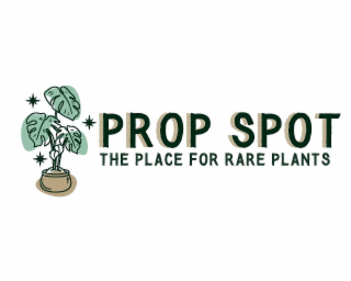 DM0000: The mark consists of The stylized wording "PROP SPOT" in uppercase letters with a drop shadow behind each letter. The words are rendered in dark green with light beige shadows, giving the text a three-dimensional appearance. Beneath “PROP SPOT” appears the tagline “THE PLACE FOR RARE PLANTS” in smaller, capitalized dark green block letters. To the left of the wording is a stylized illustration of a potted plant, likely representing a Monstera or similar rare houseplant. The plant has large, fenestrated leaves with detailed linework and is placed in a brown pot. Three star-shaped sparkles appear around the plant—two to the left and one to the right—suggesting rarity or a magical quality. The mark as a whole conveys a boutique identity centered on rare or specialty plants.