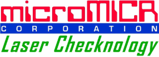 DM0000: The mark consists of the term microMICR in red stylized font, with micro being in lowercase and MICR being in uppercase, the word CORPORATION in white uppercase letters over a blue horizontal band, and the phrase LASER CHECKNOLOGY in green italics, with the first letter of each of those words being capitalized. The white background behind the words microMICR and LASER TECHNOLOGY is background and does not constitute part of the claimed mark.