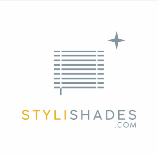 - DM0000: The mark consists of a stylized depiction of a window blind design made up of horizontal grey lines, with one vertical grey tilt Wand hanging from the lower left side of the blind. To the upper right of the blind is a four-pointed star design in grey. Below the blind design appears the word "STYLISHADES.COM", with "STYLI" in orange, and "SHADES.COM" in grey. The term ".COM" appears in smaller font size and is aligned beneath the word "SHADES". The entire design appears on a white background, which is not claimed as a feature of the mark.