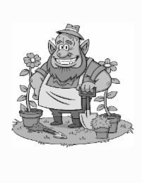 - DM0000: The mark consists of The trademark consists of a cartoonish smiling ogre wearing a hat and an apron. He is standing on a patch of grass, holding a shovel and is surrounded by 3 potted plants. There is also a garden trowel laying on the ground in front of him.