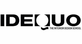DM0000: The mark consists of the stylized word “IDEQUO” in bold, uppercase letters. The letter “Q” is represented as a stylized circle interrupted by two semicircular shapes, one on the top left and one on the bottom right. Below the “Q” appears a small curved element resembling a wave or underline. To the right of the word “IDEQUO” appears the phrase “THE INTERIOR DESIGN SCHOOL” in uppercase.